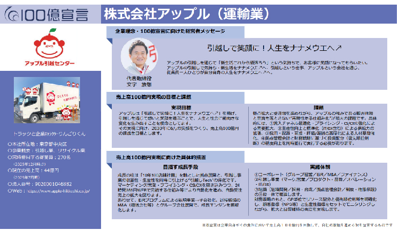 株式会社アップル(本社:東京都中央区、代表取締役:文字 放想、以下「アップル」)は、企業の成長ポータルサイトにて 「100億宣言」を発表いたしました。